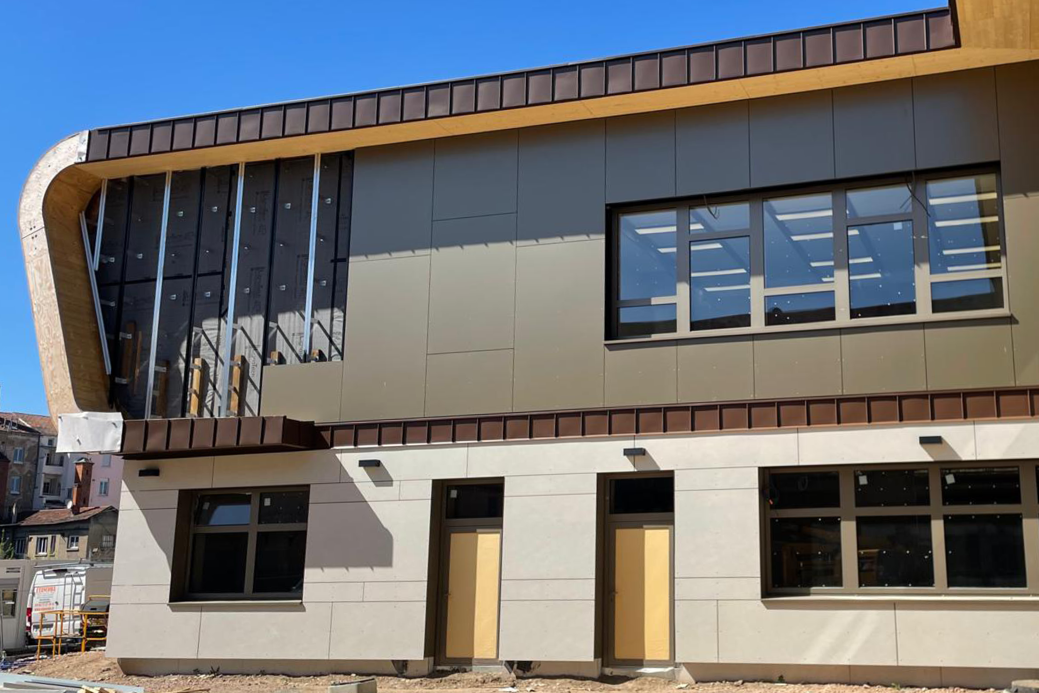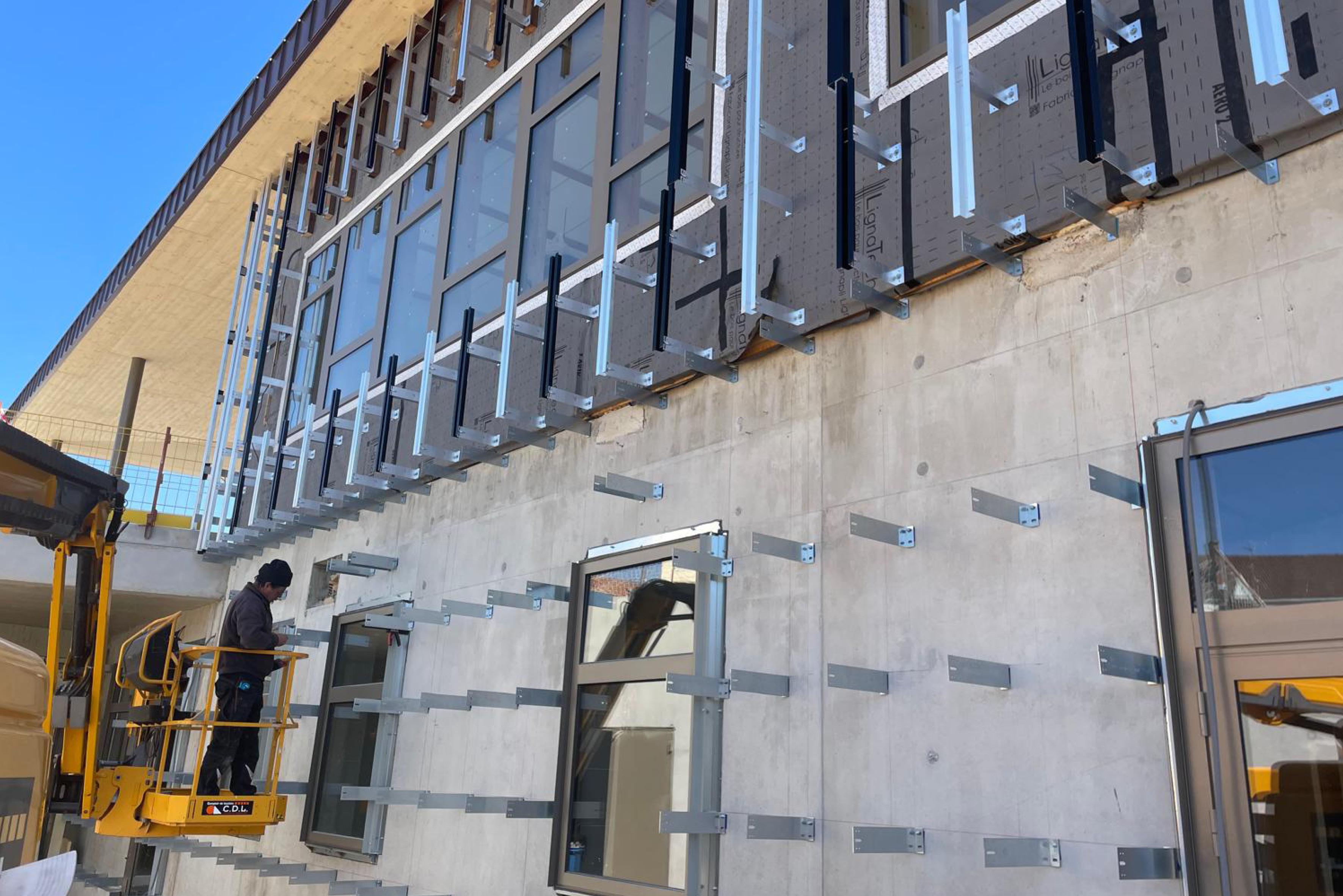 Panneaux fixés sur une ossature bois, réglage avec système patte équerres. Surface vêture fibre ciment : 675 m².
