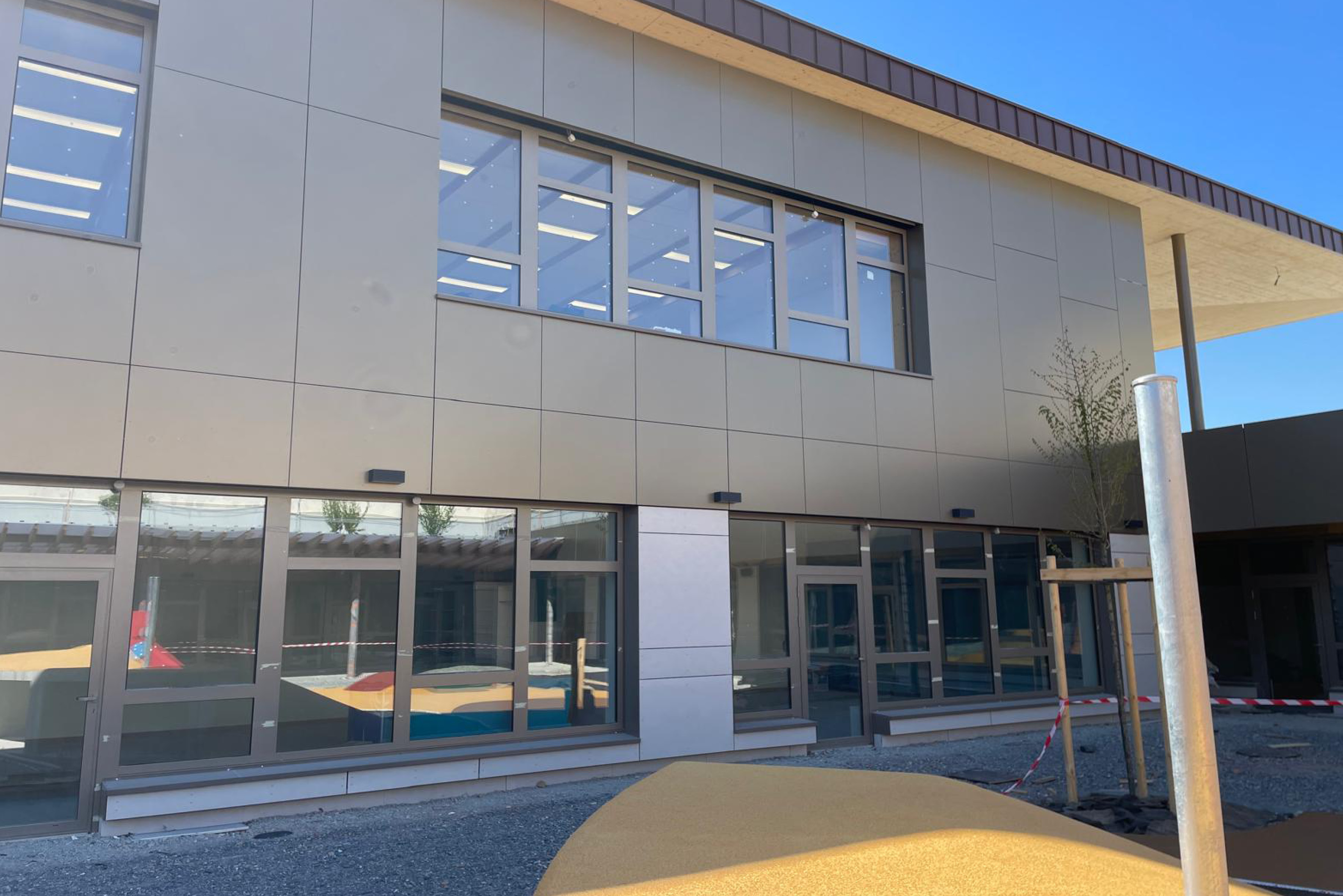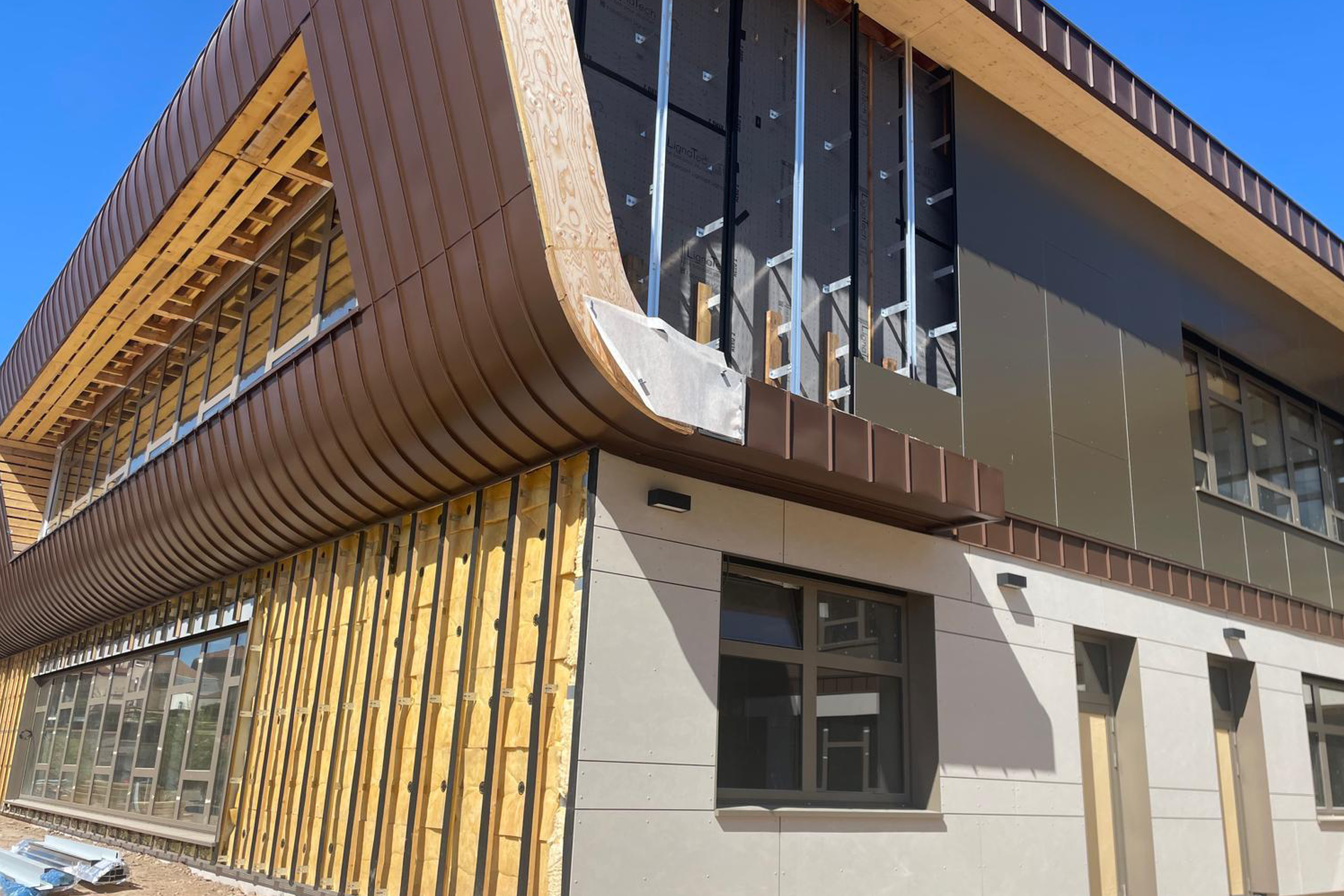 Panneaux fixés sur une ossature bois, réglage avec système patte équerres. Surface vêture fibre ciment : 675 m².